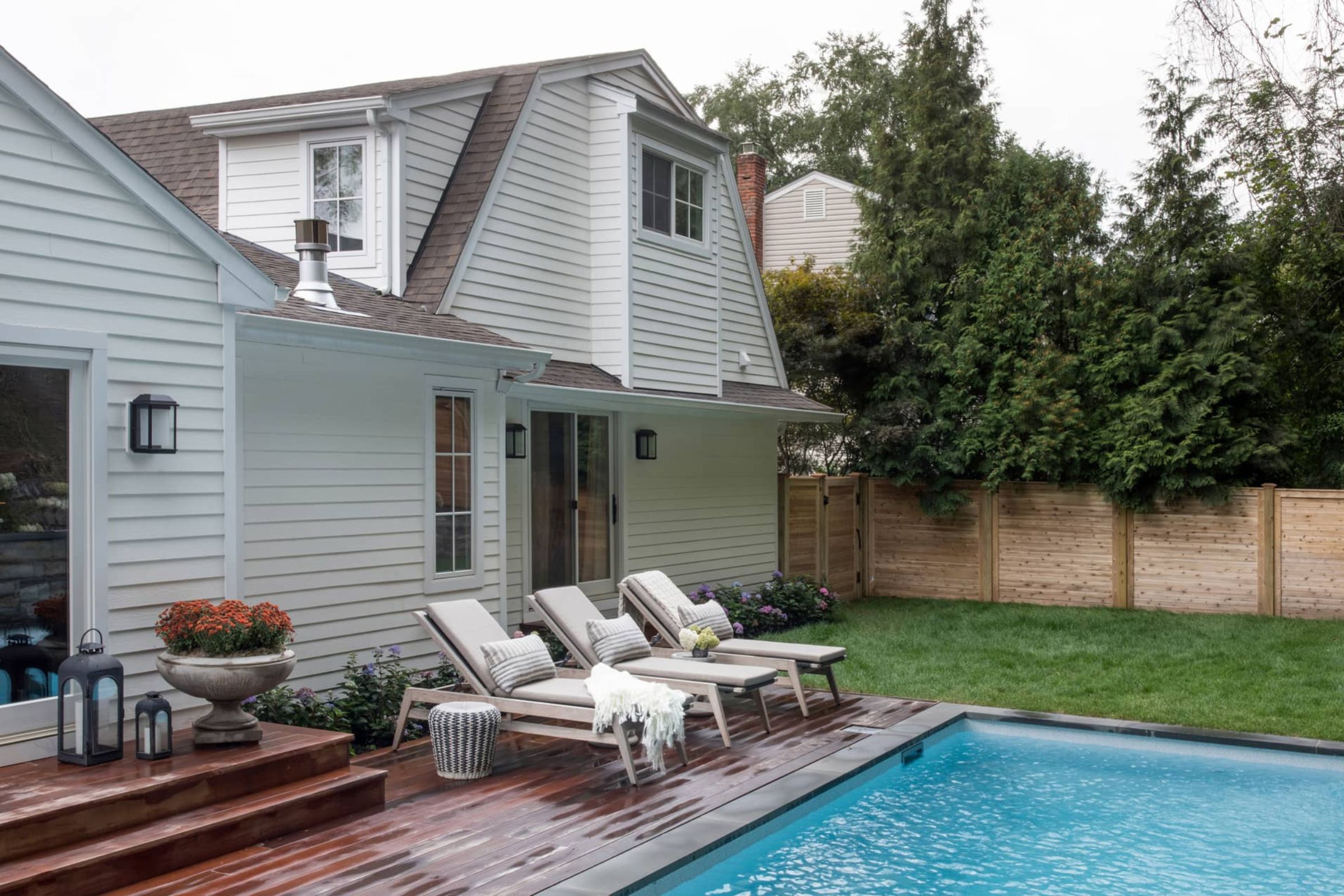 The back of the home showcases its modern white exterior, opening to a serene pool and lounge area. French doors connect indoor spaces to the outdoors, reinforcing the home’s effortless indoor-outdoor rhythm and its modern ranch identity.