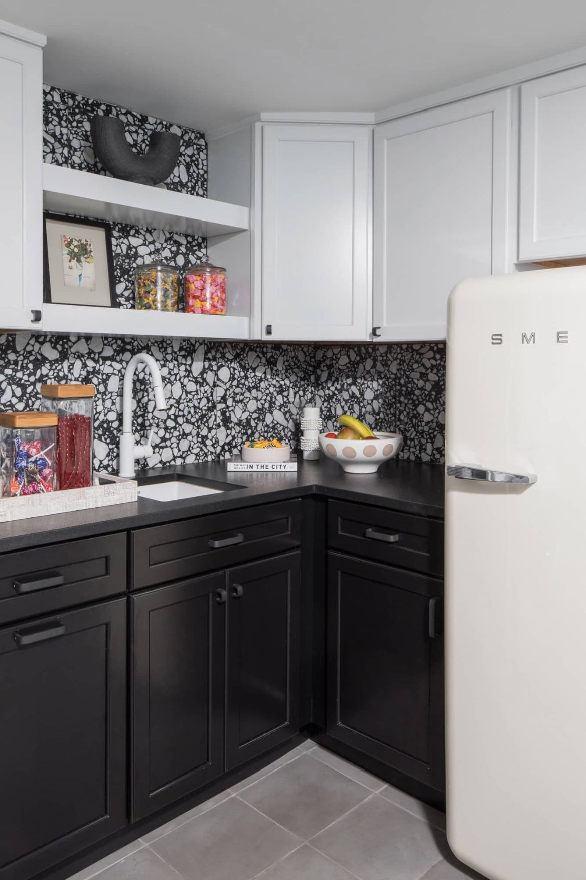 The basement kitchen extends the home’s functional flow with playful contrast. Black-and-white cabinetry, a Smeg refrigerator, and a white faucet bring modern charm to a bright, inviting space designed for easy entertaining.