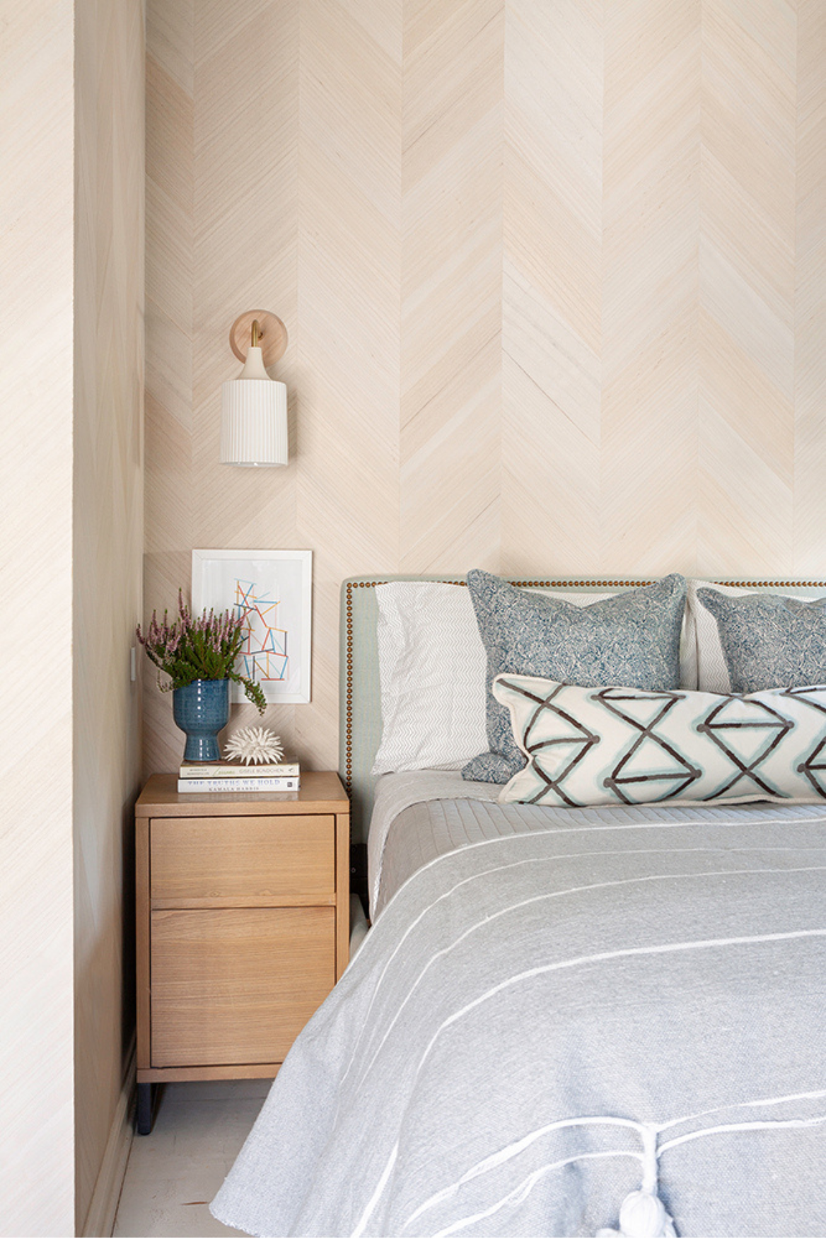 A tan chevron feature wall brings subtle pattern and warmth to this bedroom, adding visual interest without overwhelming the serene palette. This design exemplifies the home’s mix of playful detail and classic restraint.