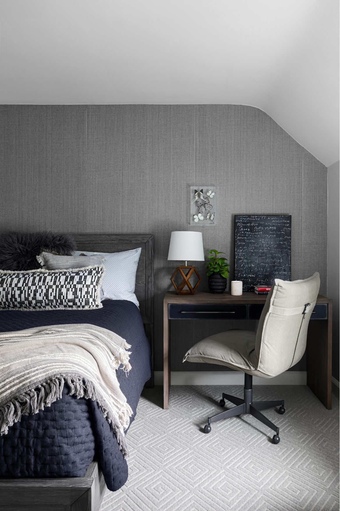 Designed for both comfort and function, this guest bedroom includes a thoughtfully placed desk ideal for work or study. Clean lines and a neutral palette highlight the home’s balance of utility and classic modern style.
