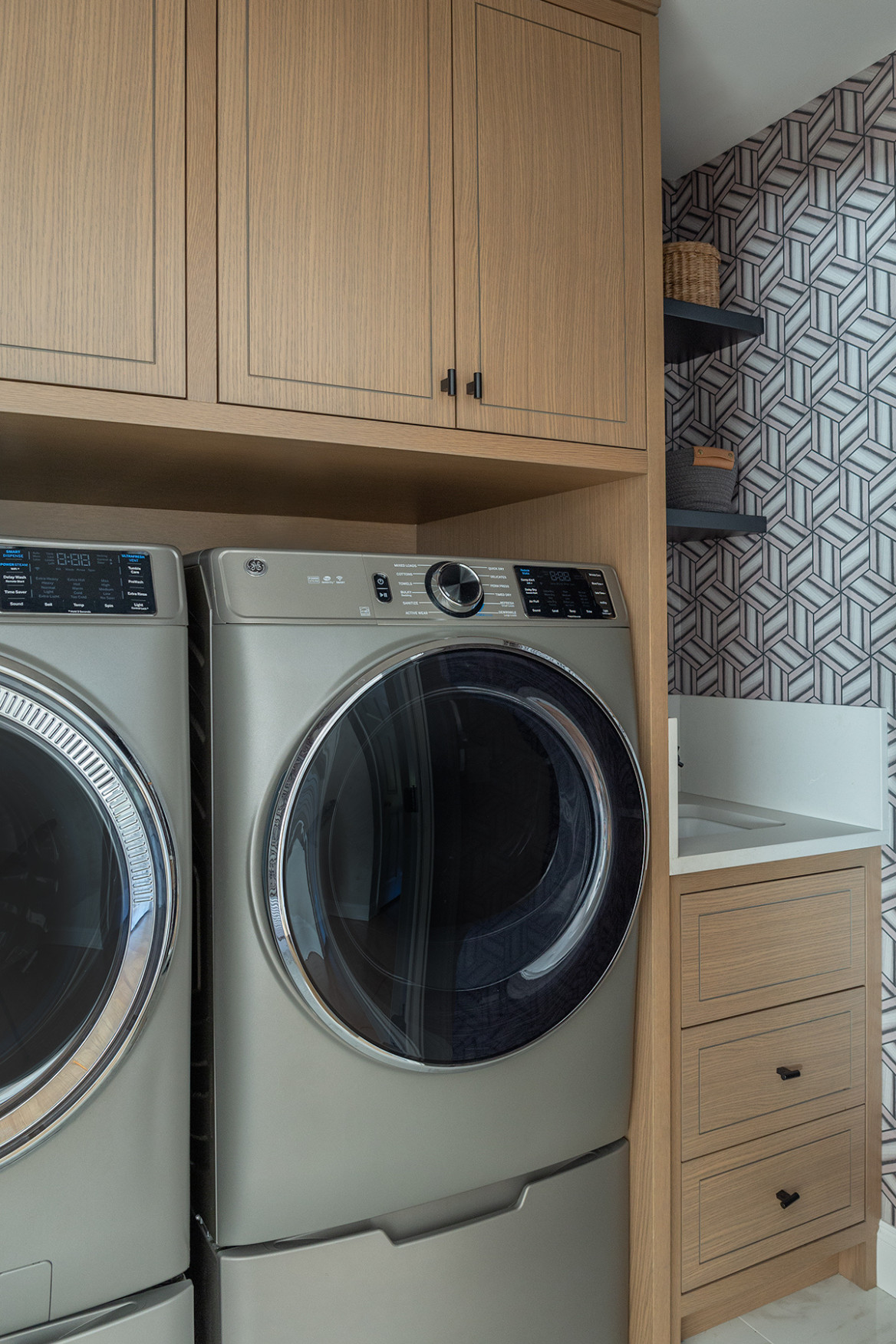 This laundry room continues the home’s contemporary Colonial design with pale custom cabinetry, built-in millwork storage, and understated materials that bring calm, functional elegance to everyday routines.