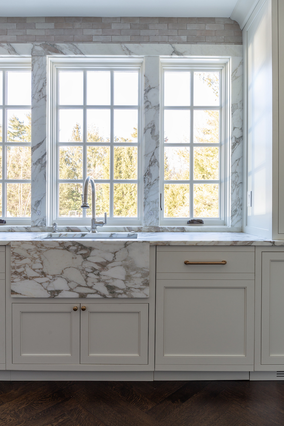 This transitional style kitchen showcases premium quartzite surfaces, bespoke millwork, and brass details that enhance the refined warmth of this family home renovation.