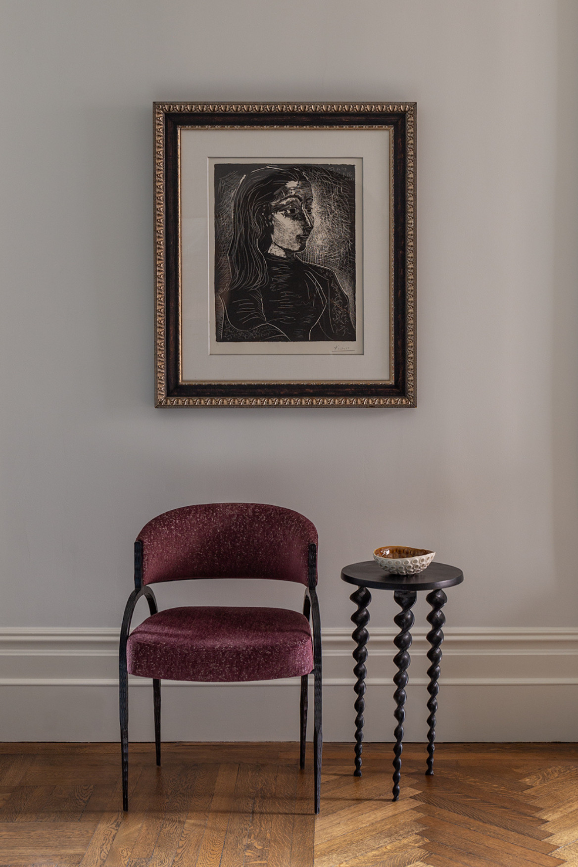 A curated hallway in this Manhattan apartment showcases fine art beneath museum-quality lighting. A plum velvet accent chair anchors the space, blending prewar apartment character with luxury pied-à-terre elegance and NYC interior design flair.