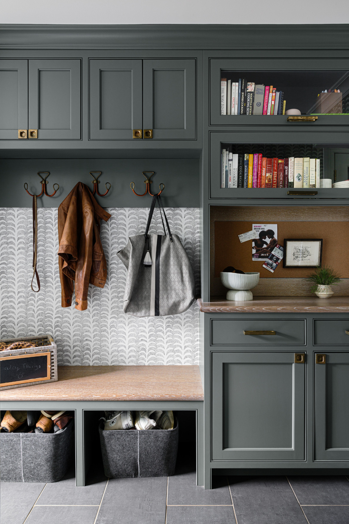This thoughtfully designed Westfield, New Jersey mudroom transforms daily arrivals into calm, organized moments. Herringbone porcelain tile adds texture underfoot, while custom cubbies with integrated charging stations keep essentials in order. A built-in bench with hidden shoe storage combines functionality and style, showcasing the home’s transitional interior…