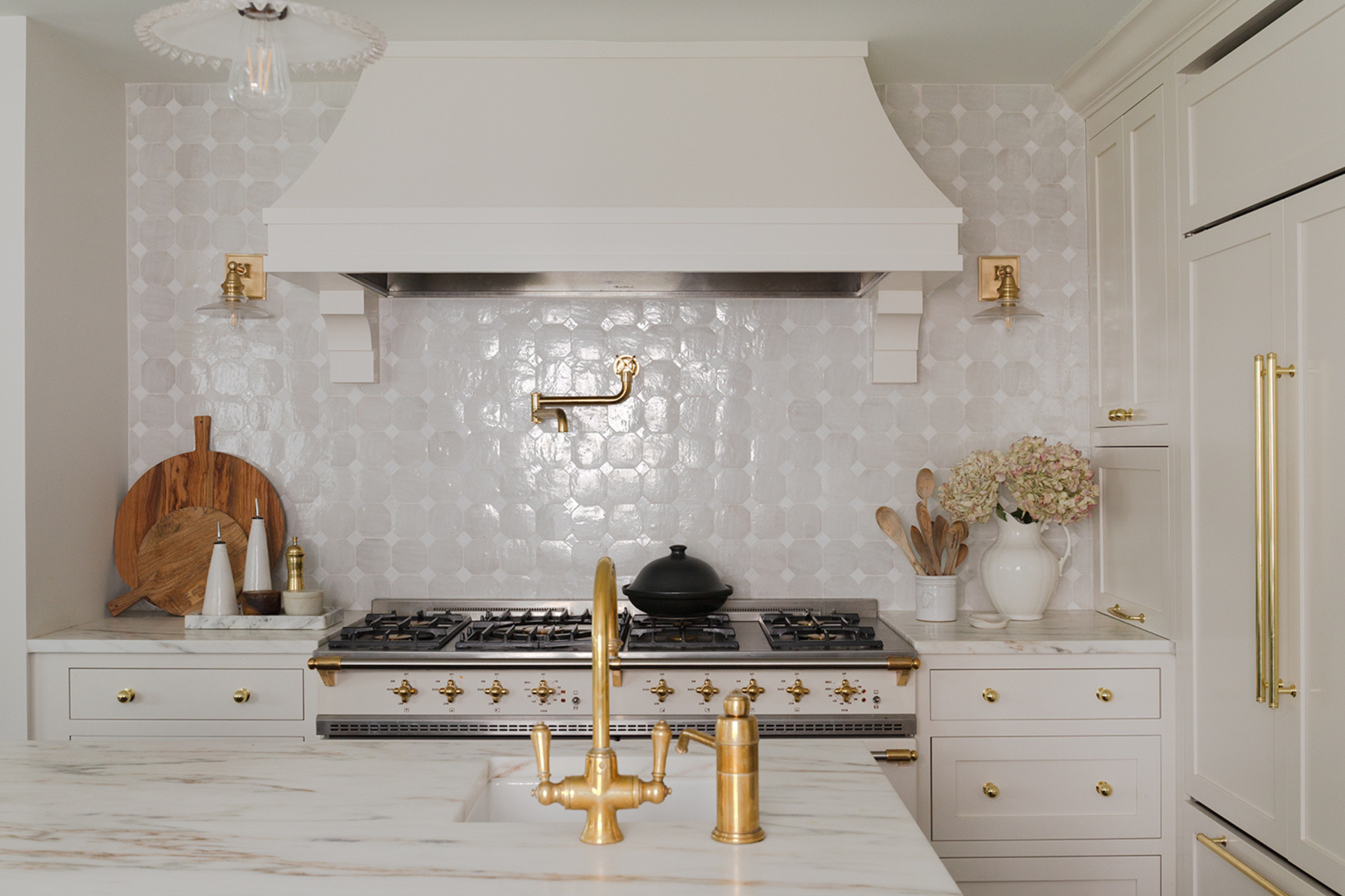 The kitchen in this Westfield NJ Tudor Revival home combines classic Tudor charm with modern elegance. A vintage-inspired range cooker sits beneath a custom hood, flanked by white cabinets with gold hardware. Light dances off the textured tile backsplash, while Parisian-inspired details and warm metallic accents create…