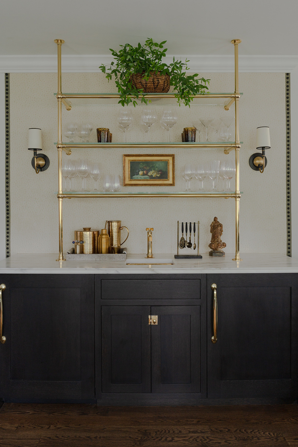 A custom bar counter inside a Westfield NJ Tudor Revival house featuring rich wood cabinets, a marble countertop, and unlacquered brass shelving—blending Tudor Revival architecture with high-end historic-inspired interior design.