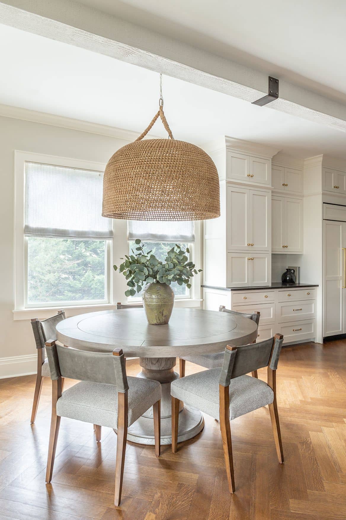 A welcoming kitchen dining nook featuring a circular table, painted structural beams, and softly layered textures—blending Victorian interior design with modern functionality in this Westfield New Jersey farmhouse remodel.